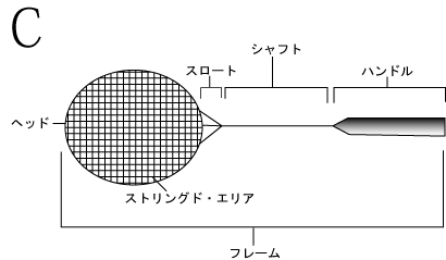 - ラケットは、フレームの全長で680mm以内、幅は230mm以内とし、それを構成している主な部位については次の(1)から (5)のとおりとする。各部位の名称は図Cのとおりである。