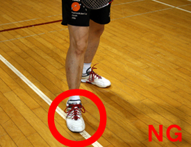 - サーバーおよびレシーバーの両足の一部分は、サービスを始めてから(本状第2項参照)サービスがなされるまで、(本条第3項参照)、その位置でコート面に接していなければならない。